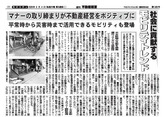 この度、CPGが「社会に貢献するモビリティトレンド」として「週刊不動産経営」紙面にて紹介いただきました。